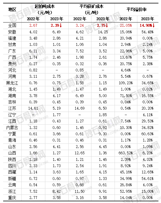 如下表所示,2023年上半年全国新成交采矿权起拍吨成本及平均获矿成本均较2022年同期有所下降。其中,2022年仅江苏、山西及浙江三省平均获矿成本在10元/吨以上;2023年仅安徽省平均获矿成本超10元/吨。(注:省吨获矿成本=本省总成交价格/本省总储量)。总的来说,砂石吨获矿成本与矿权所在地市的砂石消费水平和地理位置,呈现出沿江、沿海且砂石需求大的地区矿权价格相对较高,中西部地区价格相对较低的特征。